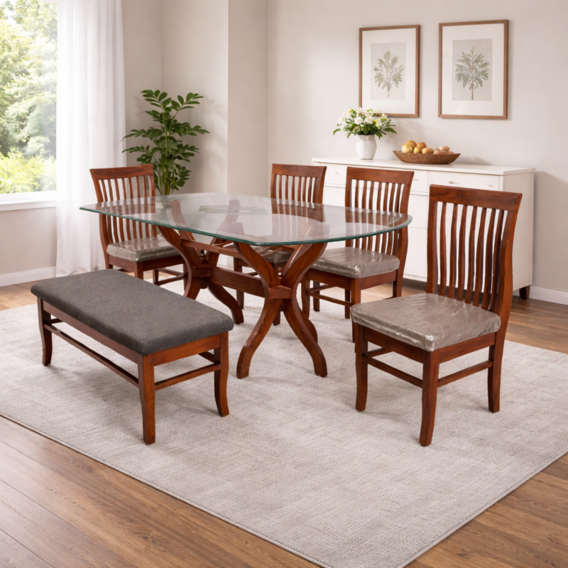 a)On the hunt for the perfect dining set? Your search ends here. Explore our range of solid wood dining sets to find the one that suits your home the best. Meal times with your family and friends should be made special only with the very best. b) Table and chairs made of Teak c) Please refer to the images for dimension details d) Indoor use only